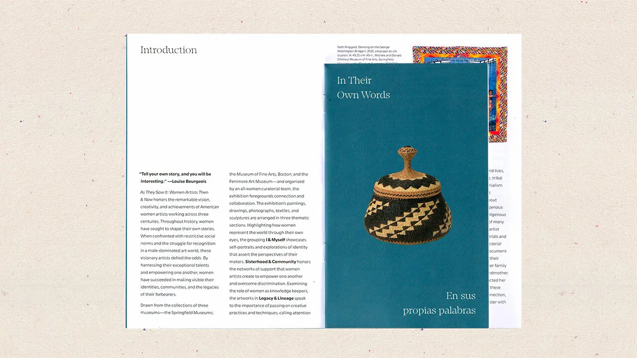 Printed on uncoated stock with blue-green fields and cropped artwork details, the brochure links two museum exhibitions through one brand system. Its bilingual design reflects Springfield’s Spanish-speaking audience and the project’s commitment to accessibility for all visitors.